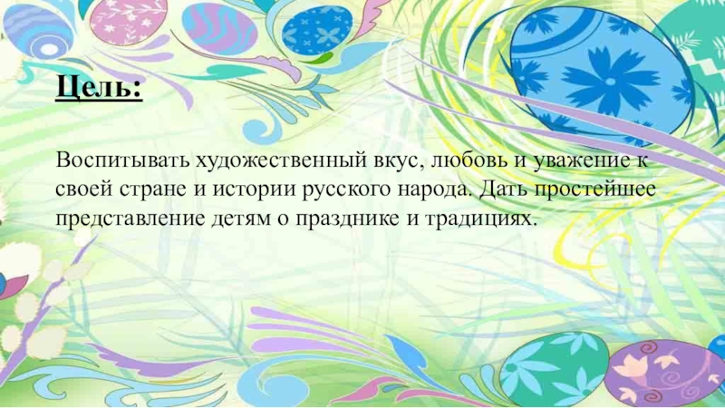 Задачи:Познакомить детей с православным праздником Пасхой, с его историей;Расширять знания детей о пасхальной атрибутике: разноцветные яйца, куличи;Рассказать