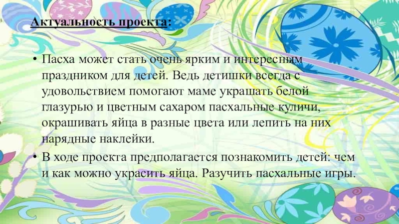 Актуальность проекта:Пасха может стать очень ярким и интересным праздником для детей. Ведь детишки всегда с