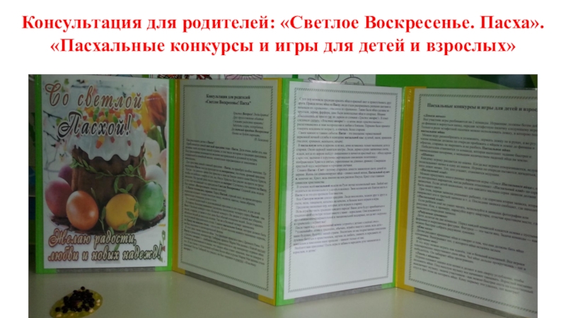 Слайд 11Консультация для родителей: «Светлое Воскресенье. Пасха». «Пасхальные конкурсы и игры для