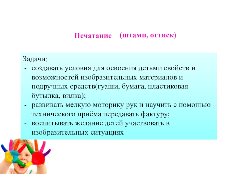 • Способствовать овладению дошкольниками простейшими техническими приемами работы с различными изобразительными материалами.