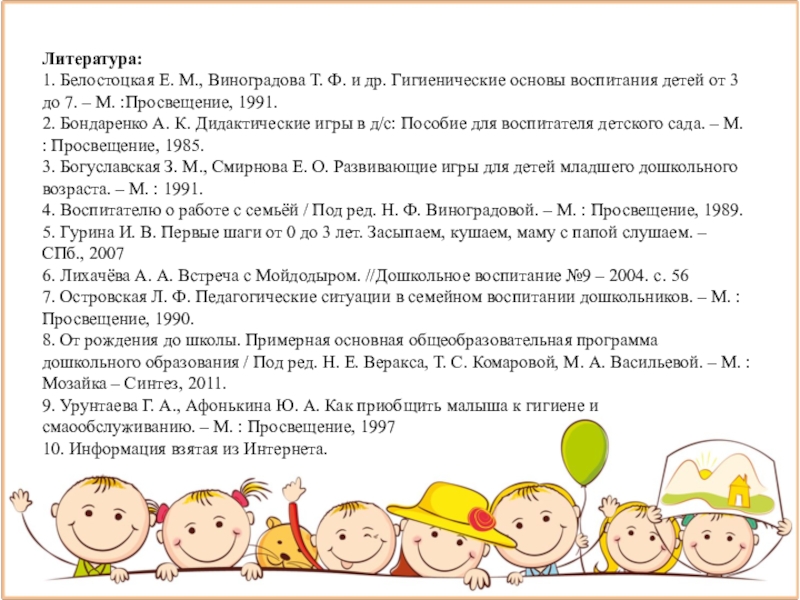 9. Урунтаева Г. А., Афонькина Ю. А. Как приобщить малыша к гигиене и смаообслуживанию. – М. : Просвещение, 1997