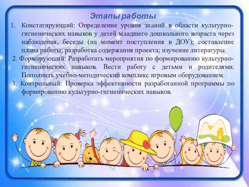 2. Формирующий: Разработать мероприятия по формированию культурно-гигиенических навыков. Вести работу с детьми и родителями. Пополнить учебно-методический комплекс игровым оборудованием.