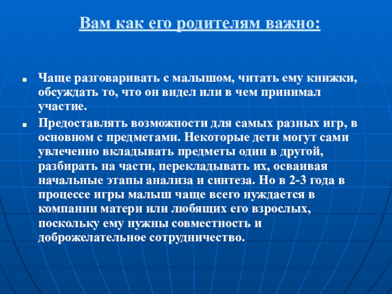 Предоставлять возможности для самых разных игр, в основном с предметами. Некоторые дети могут сами увлеченно вкладывать предметы один в другой, разбирать на части, перекладывать их, осваивая начальные этапы анализа и синтеза. Но в 2-3 года в процессе игры малыш чаще всего нуждается в компании матери или любящих его взрослых, поскольку ему нужны совместность и доброжелательное сотрудничество.