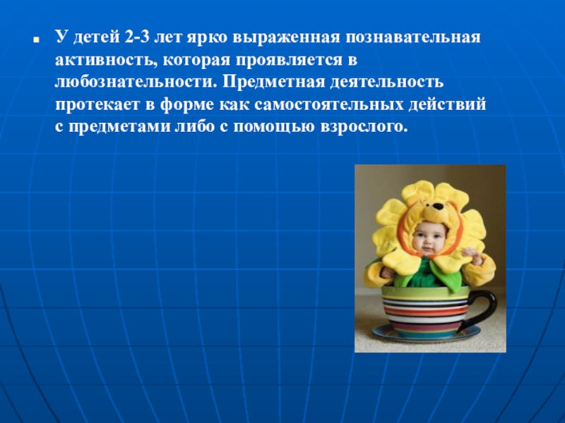 Слайд 2У детей 2-3 лет ярко выраженная познавательная активность, которая проявляется в