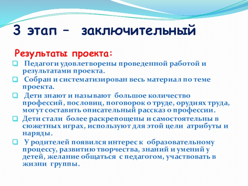 У родителей появился интерес к образовательному процессу, развитию творчества, знаний и умений у детей, желание общаться с педагогом, участвовать в жизни группы.