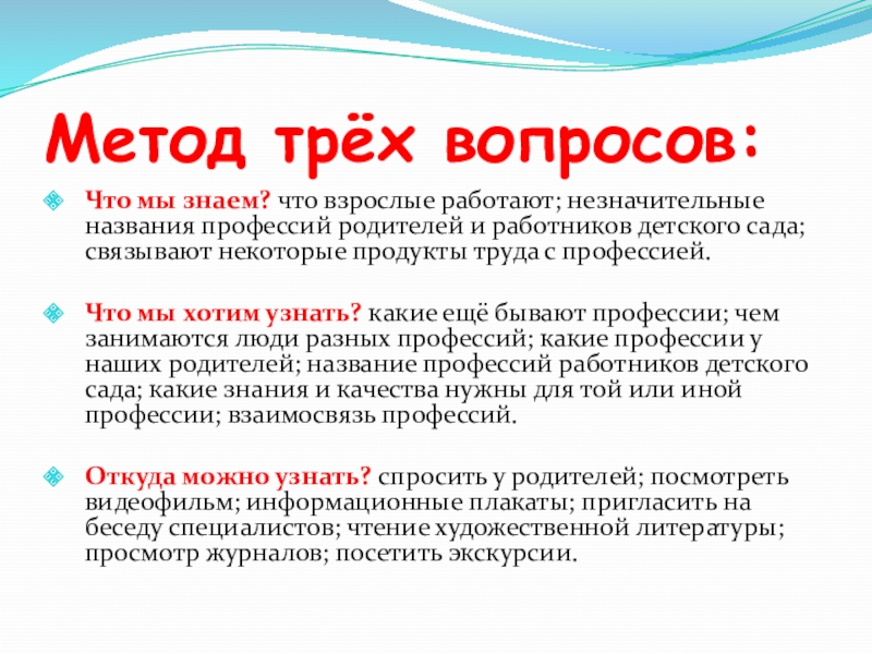 Что мы хотим узнать? какие ещё бывают профессии; чем занимаются люди разных профессий; какие профессии у наших родителей; название профессий работников детского сада; какие знания и качества нужны для той или иной профессии; взаимосвязь профессий.