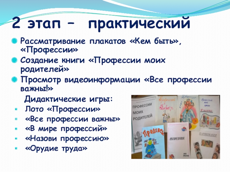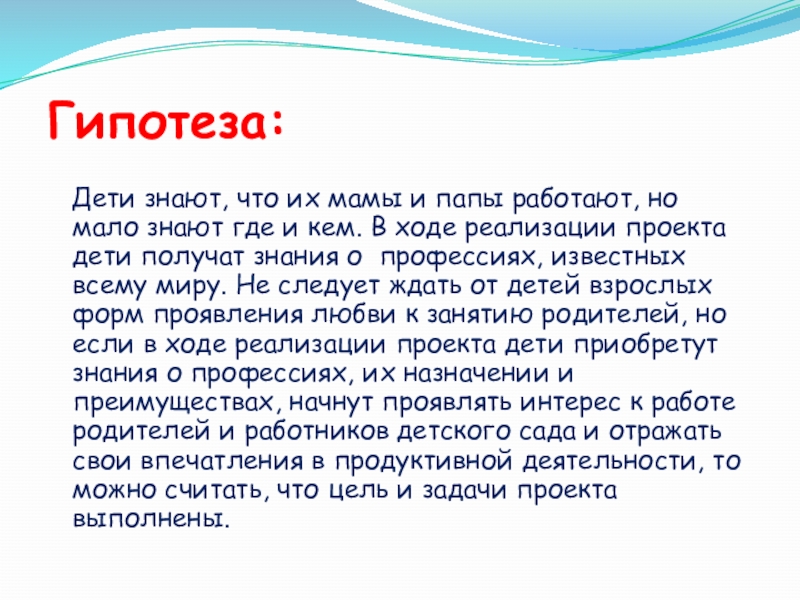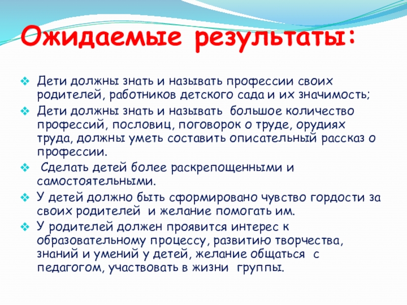 мало знают где и кем. В ходе реализации проекта дети получат знания о профессиях, известных всему миру. Не следует ждать от детей взрослых форм проявления любви к занятию родителей, но если в ходе реализации проекта дети приобретут знания о профессиях, их назначении и преимуществах, начнут проявлять интерес к работе родителей и работников детского сада и отражать свои впечатления в продуктивной деятельности, то можно считать, что цель и задачи проекта выполнены.