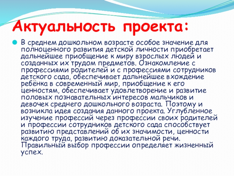 личности приобретает дальнейшее приобщение к миру взрослых людей и созданных их трудом предметов. Ознакомление с профессиями родителей и с профессиями сотрудников детского сада, обеспечивает дальнейшее вхождение ребёнка в современный мир, приобщение к его ценностям, обеспечивает удовлетворение и развитие половых познавательных интересов мальчиков и девочек среднего дошкольного возраста. Поэтому и возникла идея создания данного проекта. Углубленное изучение профессий через профессии своих родителей и профессии сотрудников детского сада способствует развитию представлений об их значимости, ценности каждого труда, развитию доказательной речи. Правильный выбор профессии определяет жизненный успех.
