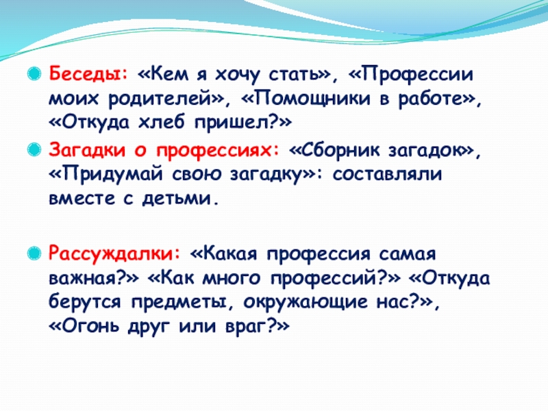 Слайд 21Беседы: «Кем я хочу стать», «Профессии моих родителей», «Помощники в работе»,