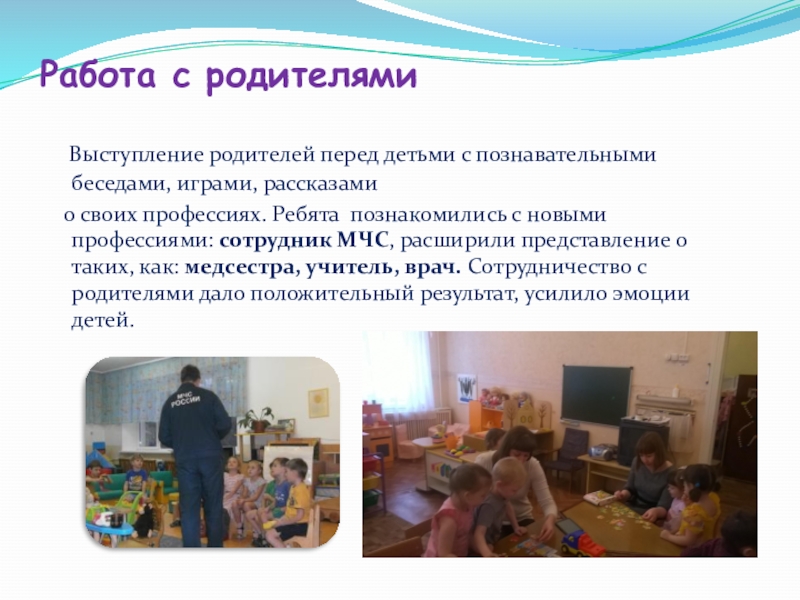 о своих профессиях. Ребята познакомились с новыми профессиями: сотрудник МЧС, расширили представление о таких, как: медсестра, учитель, врач. Сотрудничество с родителями дало положительный результат, усилило эмоции детей.