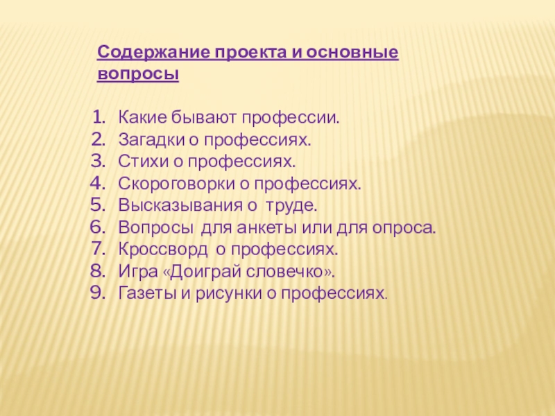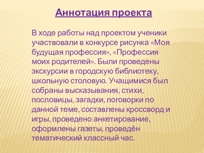 «Моя будущая профессия», «Профессия моих родителей». Были проведены экскурсии в городскую библиотеку, школьную столовую. Учащимися был собраны высказывания, стихи, пословицы, загадки, поговорки по данной теме, составлены кроссворд и игры, проведено анкетирование, оформлены газеты, проведён тематический классный час.