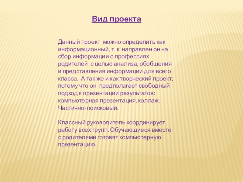 на сбор информации о профессиях родителей с целью анализа, обобщения и представления информации для всего класса. А так же и как творческий проект, потому что он предполагает свободный подход к презентации результатов: компьютерная презентация, коллаж. Частично-поисковый.