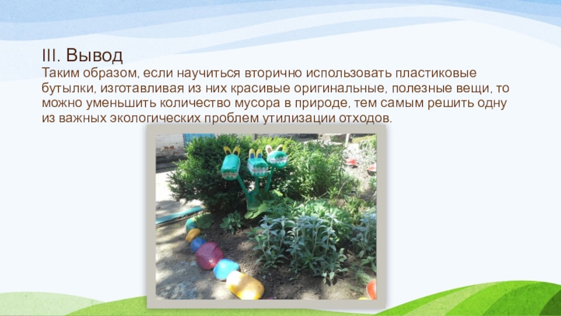 них красивые оригинальные, полезные вещи, то можно уменьшить количество мусора в природе, тем самым решить одну из важных экологических проблем утилизации отходов.