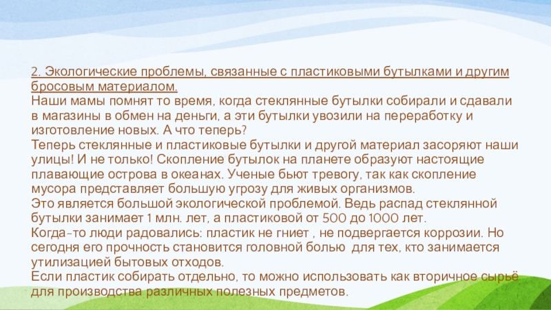 Слайд 122. Экологические проблемы, связанные с пластиковыми бутылками и другим бросовым материалом.