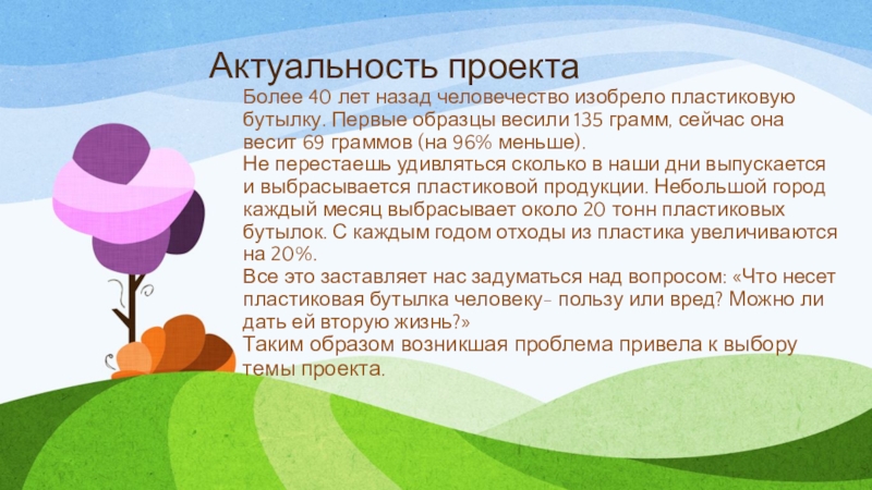 Все это заставляет нас задуматься над вопросом: «Что несет пластиковая бутылка человеку- пользу или вред? Можно ли дать ей вторую жизнь?»
