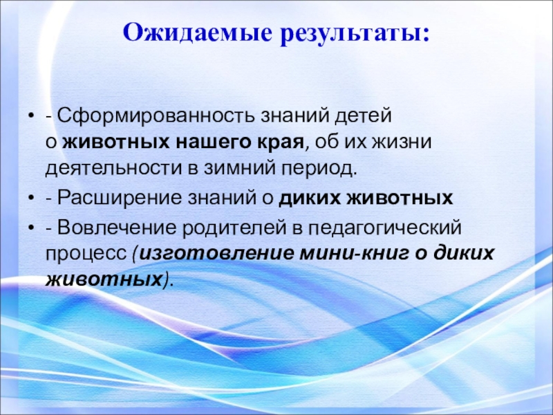 - Сформированность знаний детей о животных нашего края, об их жизни