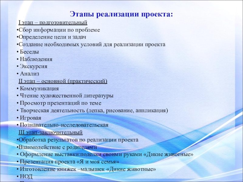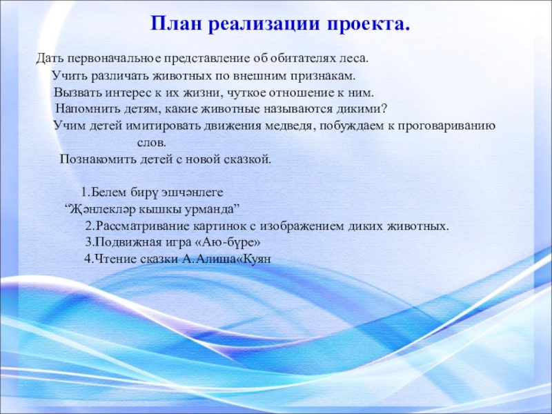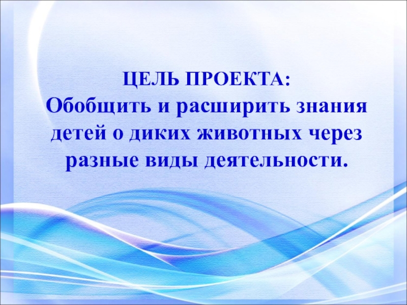 во время занятий, экскурсий, бесед, просмотра цикла телепередач «В мире животных», чтения произведений , работе по сюжетным картинам дети могли больше узнать о диких животных. Могли проследить взаимосвязь и взаимозависимость: в природе с изменением времени года происходят изменения в жизни диких животных. Главной задачей является научить узнавать и определять животных по цвету их шерсти, по части тела, издаваемым звукам, повадкам, характерной пищи, передвижению. Рассказать о питании, жилище, способе добывания и запасания пищи на зиму, размножении, детёнышах и заботе взрослых животных о своём потомстве. Отображать свои впечатления в продуктивной деятельности (рисунках, аппликациях, лепке, подвижных играх, играх драматизациях).Познакомить со стихами, песнями, загадками о диких животных. Развивать у детей познавательную активность, психические процессы. Активизировать и обогащать словарь по теме. Воспитывать интерес к живой природе.