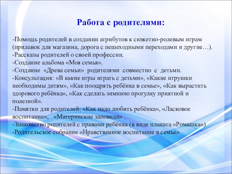 -Консультация: «В какие игры играть с детьми», «Какие игрушки необходимы детям», «Как поощрять ребёнка в семье», «Как вырастить здорового ребёнка», «Как сделать зимнюю прогулку приятной и полезной».
