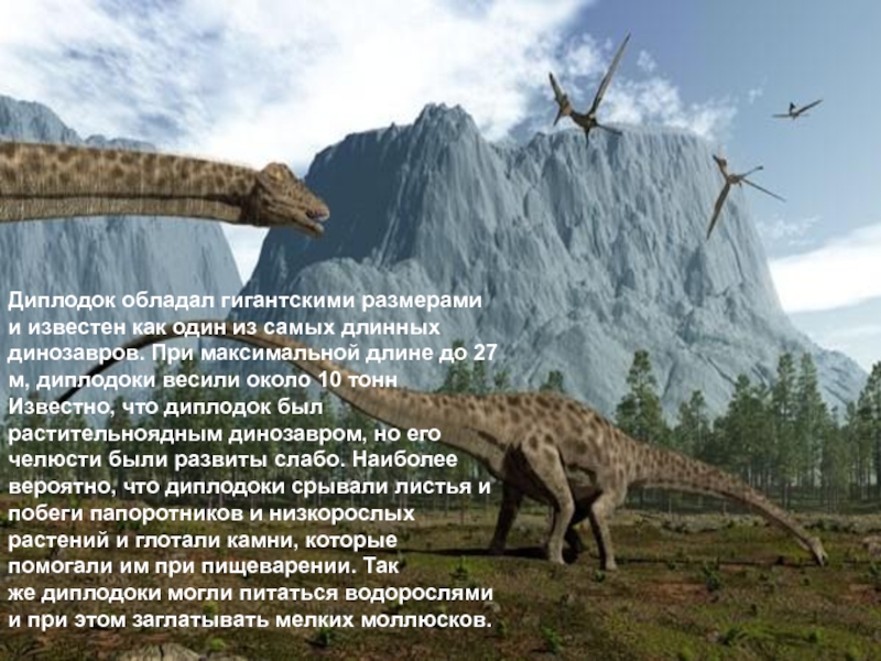Слайд 11Диплодок обладал гигантскими размерами и известен как один из самых длинных динозавров.