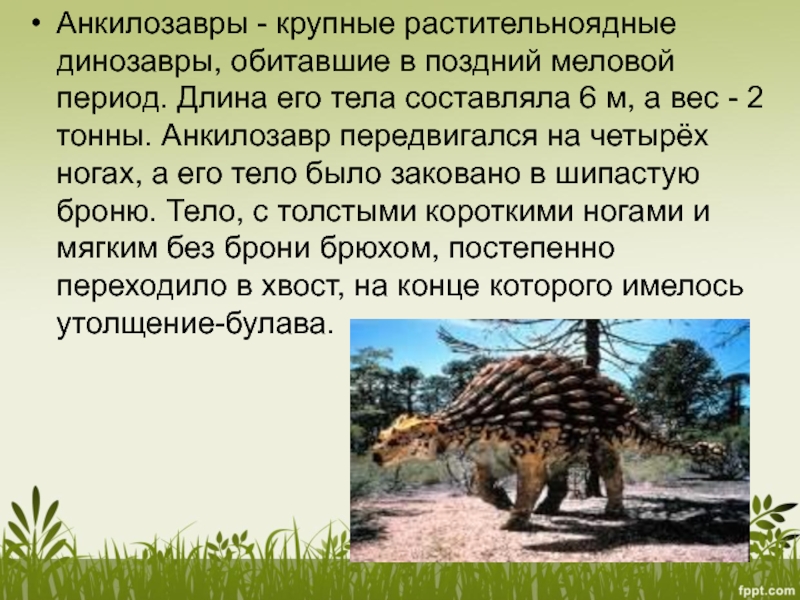 Слайд 20Анкилозавры - крупные растительноядные динозавры, обитавшие в поздний меловой период. Длина