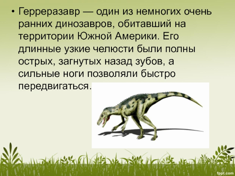 Слайд 6Герреразавр — один из немногих очень ранних динозавров, обитавший на территории