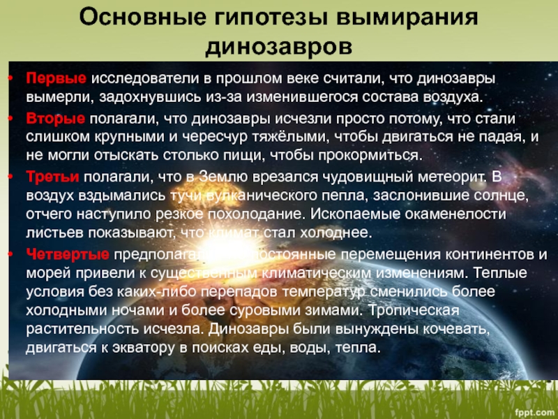 Слайд 32Основные гипотезы вымирания динозавров
