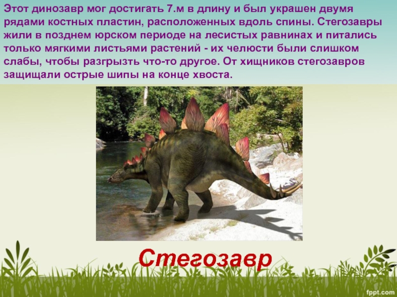 рядами костных пластин, расположенных вдоль спины. Стегозавры жили в позднем юрском периоде на лесистых равнинах и питались только мягкими листьями растений - их челюсти были слишком слабы, чтобы разгрызть что-то другое. От хищников стегозавров защищали острые шипы на конце хвоста.