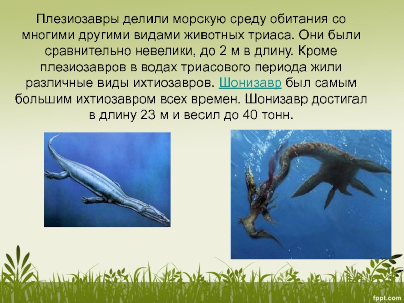 Они были сравнительно невелики, до 2 м в длину. Кроме плезиозавров в водах триасового периода жили различные виды ихтиозавров. Шонизавр был самым большим ихтиозавром всех времен. Шонизавр достигал в длину 23 м и весил до 40 тонн.