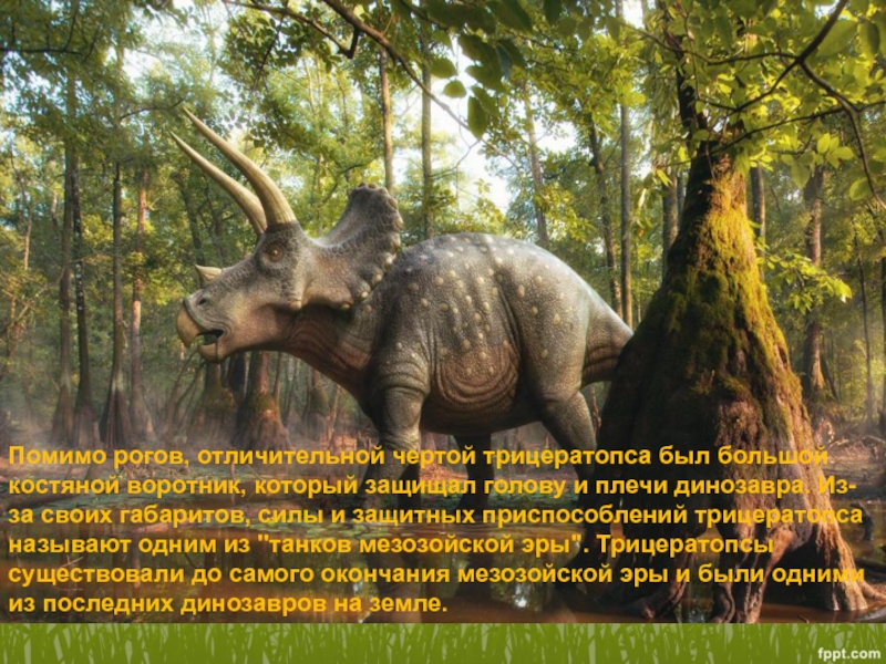 голову и плечи динозавра. Из- за своих габаритов, силы и защитных приспособлений трицератопса называют одним из "танков мезозойской эры". Трицератопсы существовали до самого окончания мезозойской эры и были одними из последних динозавров на земле.