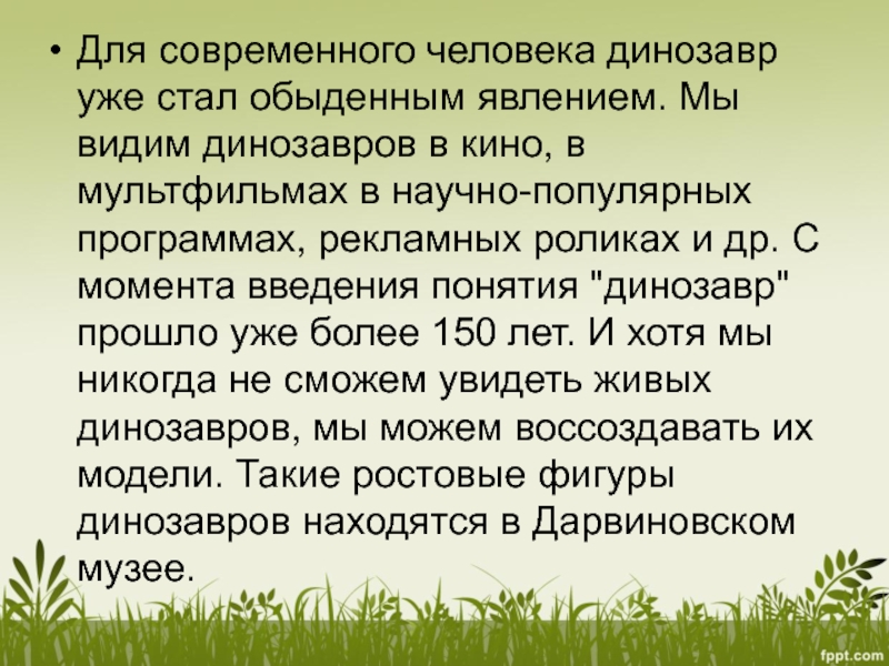 в кино, в мультфильмах в научно-популярных программах, рекламных роликах и др. С момента введения понятия "динозавр" прошло уже более 150 лет. И хотя мы никогда не сможем увидеть живых динозавров, мы можем воссоздавать их модели. Такие ростовые фигуры динозавров находятся в Дарвиновском музее.