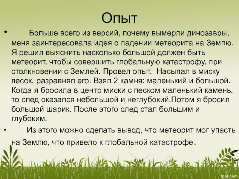 заинтересовала идея о падении метеорита на Землю. Я решил выяснить насколько большой должен быть метеорит, чтобы совершить глобальную катастрофу, при столкновении с Землей. Провел опыт. Насыпал в миску песок, разравнял его. Взял 2 камня: маленький и большой. Когда я бросила в центр миски с песком маленький камень, то след оказался небольшой и неглубокий.Потом я бросил большой шарик. После этого след стал большим и глубоким.