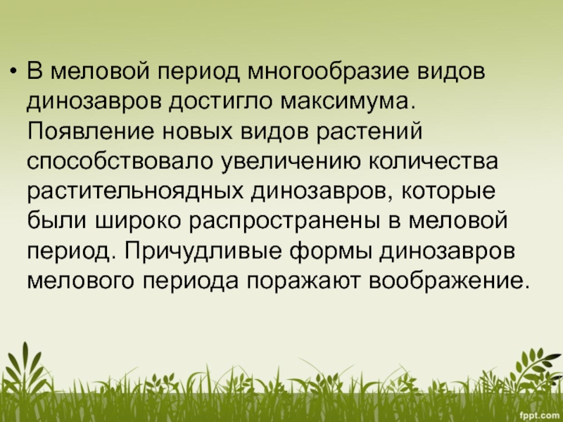 Слайд 18В меловой период многообразие видов динозавров достигло максимума. Появление новых