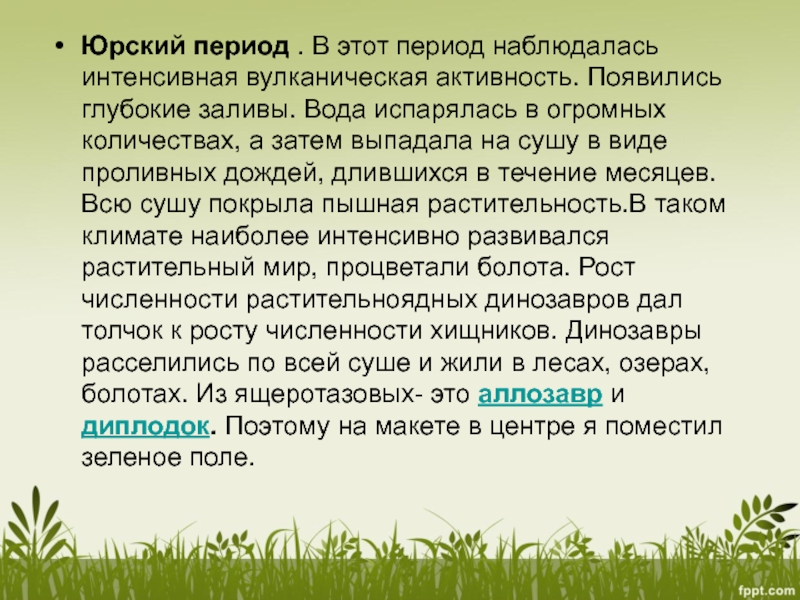 заливы. Вода испарялась в огромных количествах, а затем выпадала на сушу в виде проливных дождей, длившихся в течение месяцев. Всю сушу покрыла пышная растительность.В таком климате наиболее интенсивно развивался растительный мир, процветали болота. Рост численности растительноядных динозавров дал толчок к росту численности хищников. Динозавры расселились по всей суше и жили в лесах, озерах, болотах. Из ящеротазовых- это аллозавр и диплодок. Поэтому на макете в центре я поместил зеленое поле.