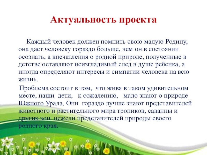 Проблема состоит в том, что живя в таком удивительном месте, наши дети, к сожалению, мало знают о природе Южного Урала. Они гораздо лучше знают представителей животного и растительного мира тропиков, саванны и других зон нежели представителей природы своего родного края.