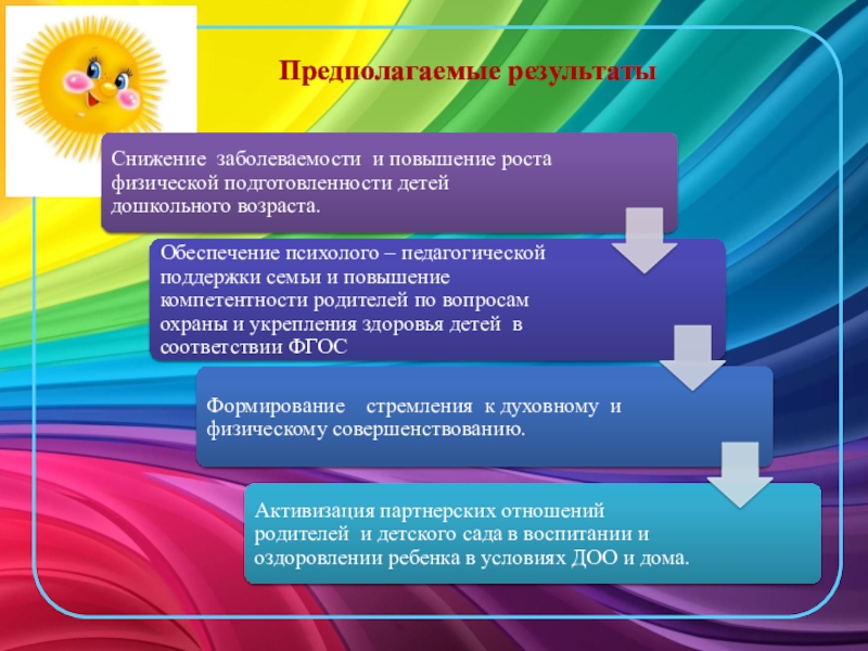 Здоровьесберегающие технологии дадут возможность обеспечить высокий уровень здоровья детей и воспитание валеологической, социально – психологической и духовно – нравственной культуры, применительно к взрослым – поможет становлению культуры профессионального здоровья воспитателей ДОО и валеологическому просвещению родителей.