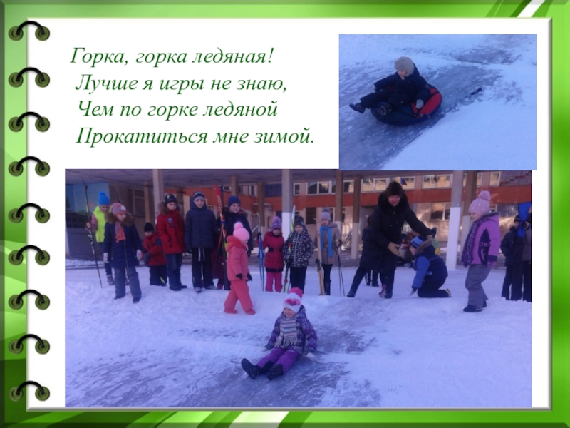 Слайд 8Горка, горка ледяная!   Лучше я игры не знаю,  Чем по горке ледяной  Прокатиться мне