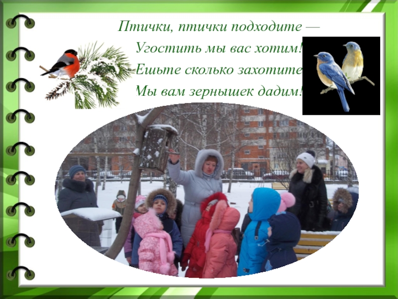 Птички, птички подходите —Угостить мы вас хотим!Ешьте сколько захотитеМы вам зернышек дадим!
