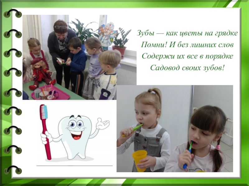Зубы — как цветы на грядкеПомни! И без лишних словСодержи их все в порядкеСадовод своих зубов!