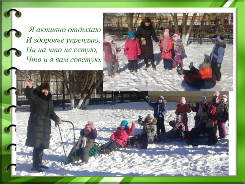 Слайд 7 Я активно отдыхаю  И здоровье укрепляю,  Ни на что не сетую,  Что и я