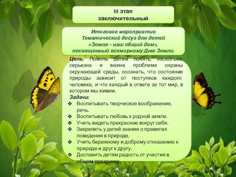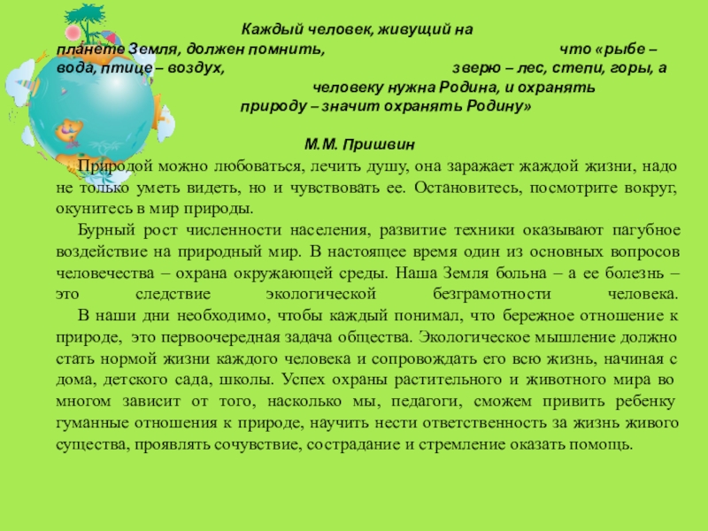 Цель. Помочь детям понять, насколько серьезна и важна проблема охраны окружающей среды, осознать, что состояние природы зависит от поступков каждого человека, и что каждый в ответе за тот мир, в котором мы живем.