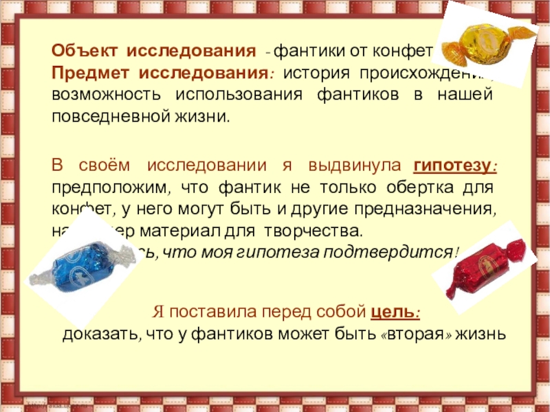 Предмет исследования: история происхождения, возможность использования фантиков в нашей повседневной жизни.