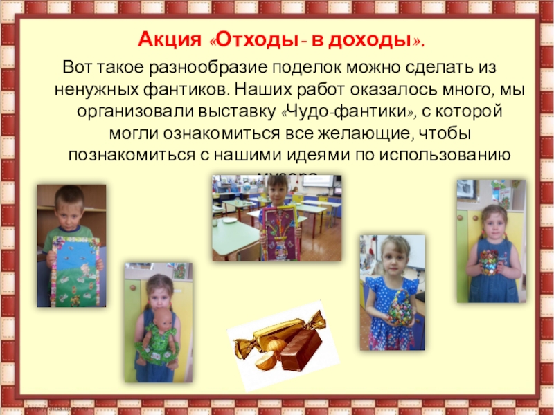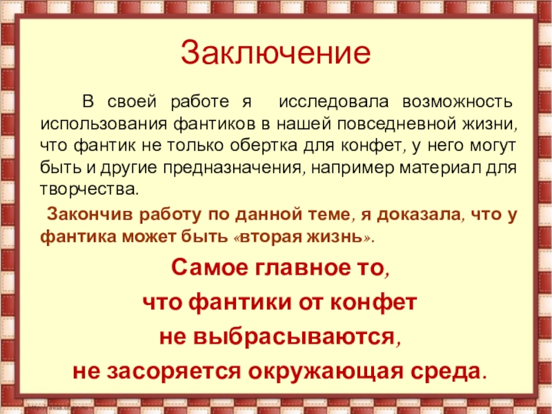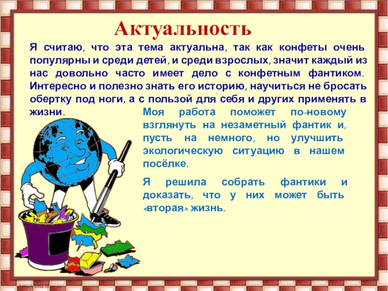 Моя работа поможет по-новому взглянуть на незаметный фантик и, пусть на немного, но улучшить экологическую ситуацию в нашем посёлке.