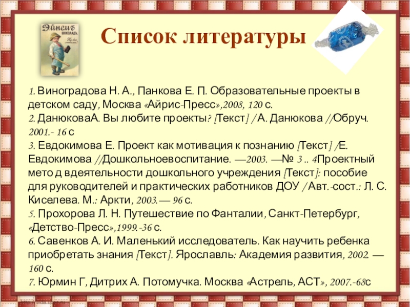 3. Евдокимова Е. Проект как мотивация к познанию [Текст] /Е. Евдокимова //Дошкольноевоспитание. —2003. —№ 3 .. 4Проектный мето д вдеятельности дошкольного учреждения [Текст]: пособие для руководителей и практических работников ДОУ / Авт.-сост.: Л. С. Киселева. М.: Аркти, 2003.— 96 с.