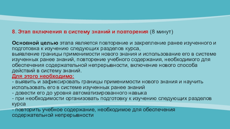 выявление границы применимости нового знания и использование его в системе изученных ранее знаний, повторение учебного содержания, необходимого для обеспечения содержательной непрерывности, включение нового способа действий в систему знаний.