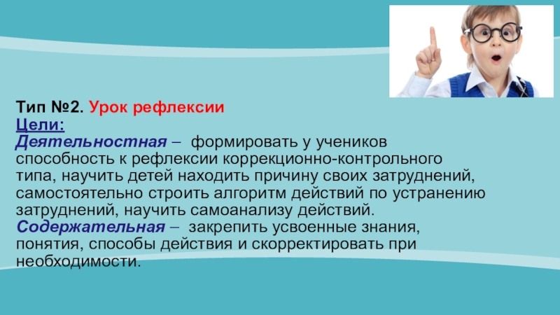 коррекционно-контрольного типа, научить детей находить причину своих затруднений, самостоятельно строить алгоритм действий по устранению затруднений, научить самоанализу действий.