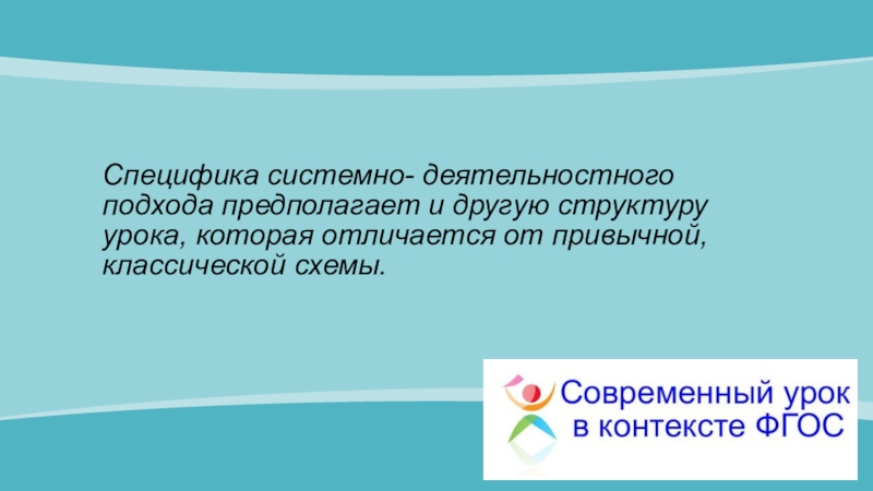 Слайд 3Специфика системно- деятельностного подхода предполагает и другую структуру урока, которая отличается
