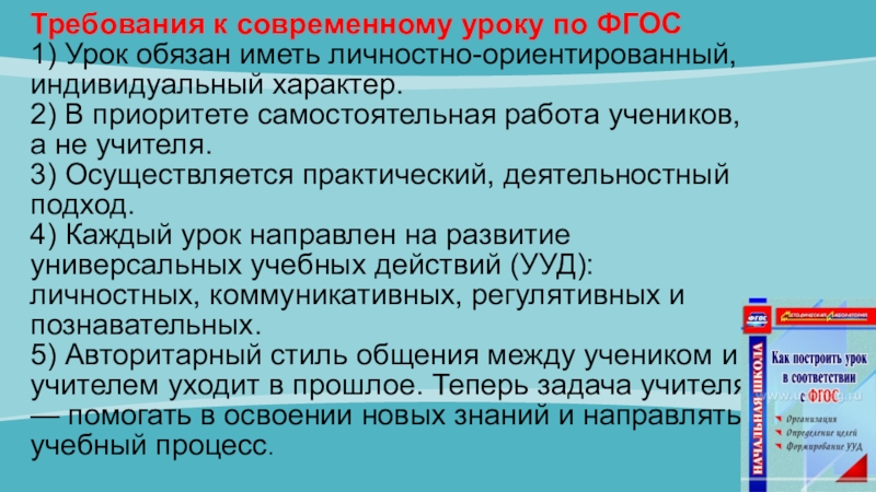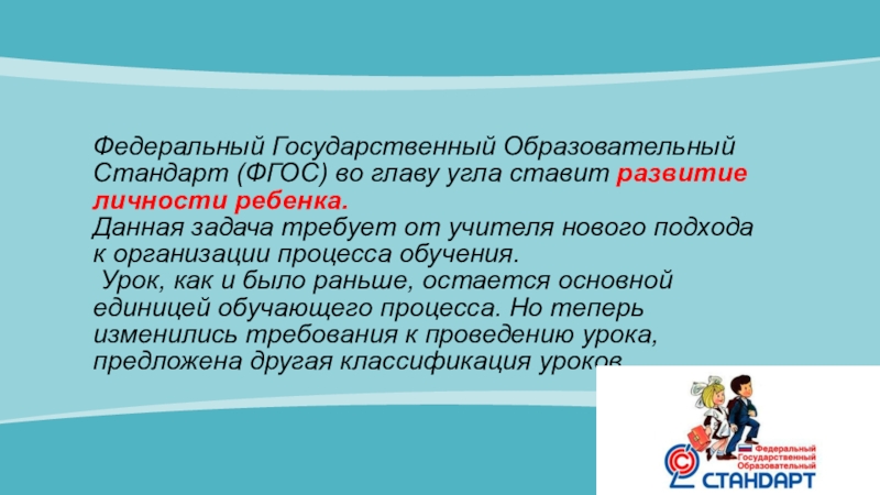 Урок, как и было раньше, остается основной единицей обучающего процесса. Но теперь изменились требования к проведению урока, предложена другая классификация уроков