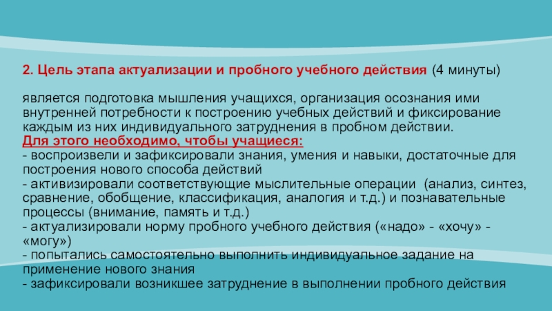 Слайд 152. Цель этапа актуализации и пробного учебного действия (4 минуты)