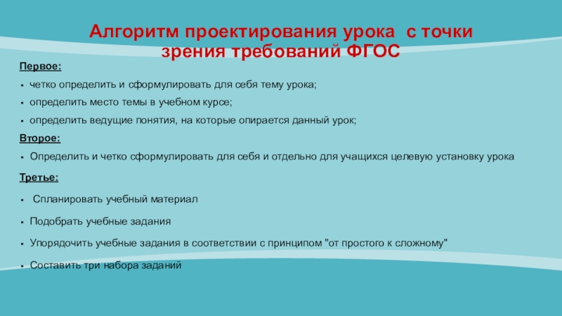 Слайд 5Алгоритм проектирования урока с точки зрения требований ФГОС