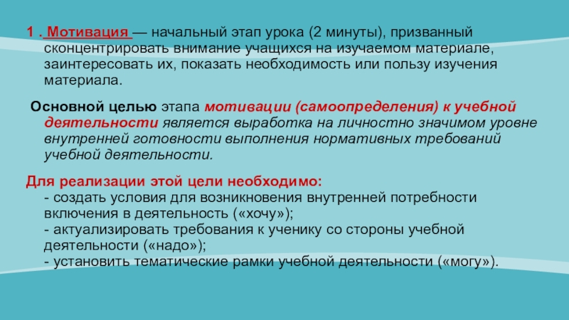 Основной целью этапа мотивации (самоопределения) к учебной деятельности является выработка на личностно значимом уровне внутренней готовности выполнения нормативных требований учебной деятельности.